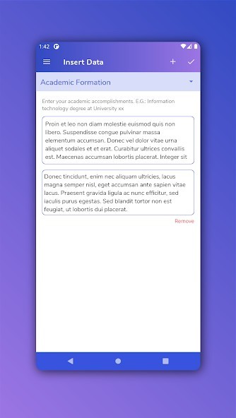 It prepares in a quick and practical way, a resume that can be generated in PDF and send by e-mail by the app. All these features gathered into a useful and productive application.The main features of the Curriculum Manager are: