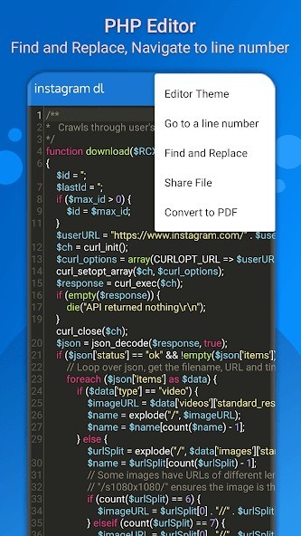 In PHP Viewer you can easily save the edited php file and also view it within the app for easy navigation. In PHP viewer you can directly convert php to pdf file without any code lose.PHP editor has very useful feature like undo, redo, find and replace etc which help user while editing code. Php file opener or file reader has different editor themes which will beautify the code with different syntax highlighting and help user to view the code easily. The font size of editor can easily be change from app setting.